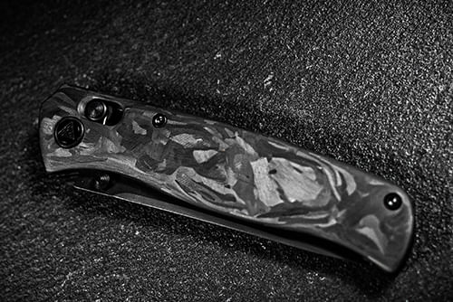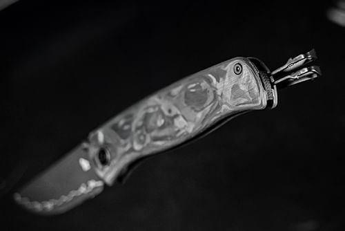 O Wolf Attack 255 FB2 é um canivete premium que utiliza, em sua tala, o material fibra de carbono “shredded”. A fibra de carbono “shredded” é composta por pequenos pedaços de fibra de carbono dispostos de forma aleatória, que criam uma aparência única — semelhante a um camuflado — e apresenta, como características mecânicas, alta resistência, leveza e rigidez.